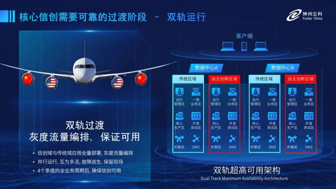 为帮助客户更好地应对数字经济时代对应用可持续性的高要求,实现信创与数字化兼得,酷游九州推出了双轨超高可用架构。双轨超高可用架构在双活数据中心的分区调度基础上,增加信创域和非信创域的分域调度,实行信创域与传统域应用全量部署,使双中心运营变为双中心四区域并行运行,互为多活,将传统架构变为分区分域协同的多活双轨超高可用架构。帮助客户在新架构下,保障“信创”的同时解决性能瓶颈,提升稳定性,保证应用可持续性,最终实现信创区域和非信创区域的平滑过渡,完成国产化替代目标。”