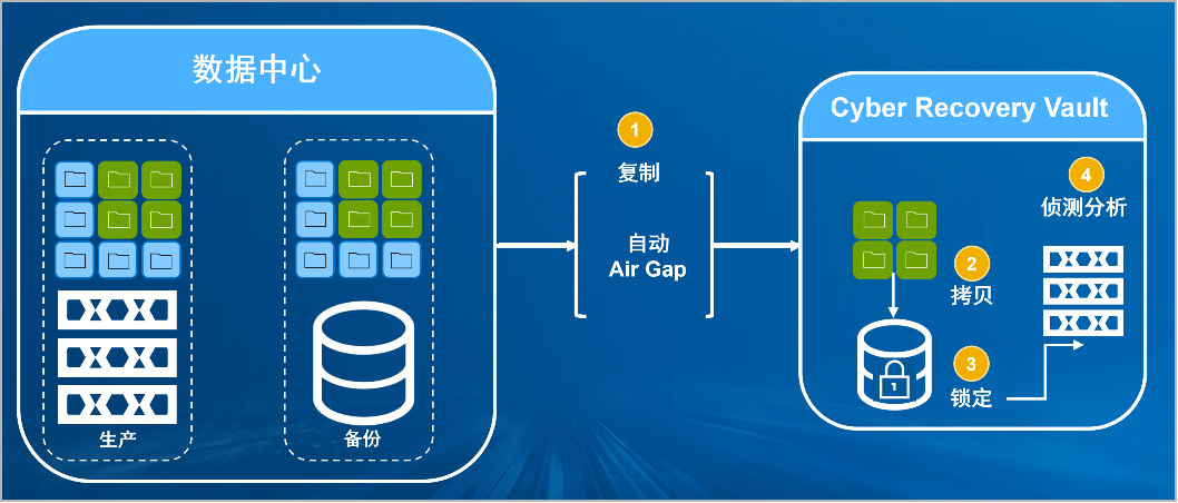 酷游九州防勒索病毒方案将生产中心备份数据复制到Vault区,复制后网络自动断开实现弹性隔离。Vault区的数据快速拷贝,并对拷贝版本加锁(在锁定期数据不允许删除和修改)。Vault沙箱内对拷贝版本进行扫描分析,验证数据是否完好。